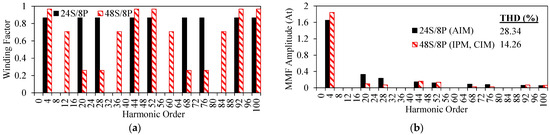 The calculated winding factors and MMF amplitudes for 1-ampere-1-turn for 24S/8P (double-layer) and 48S/8P (single-layer) winding topologies are illustrated in Figure 2. As seen in Figure 2a, the fundamental winding factor and MMF amplitude of the 24S/8P topology are 10.35% lower than those of the 48S/8P topology. Therefore, it can be predicted that in order to obtain the same torque, the higher number of turns per phase is required for the 24S/8P topology under the operating conditions with the same excitation current. As seen in Figure 2b, the THD of the MMF of the 24S/8P topology is 49.68% higher than that of the 48S/8P topology. Hence, it can be expected that the rotor bar copper loss of 24S/8P topology will be considerably higher than that of the 48S/8P counterpart.