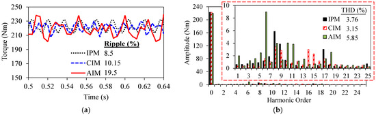 For IPM machines and IMs, the current angle providing the maximum torque in motor operation mode has been determined to be 270° and 0° electrical degrees, respectively. Figure 5 illustrates the calculated electromagnetic torque waveforms and their harmonic spectra. As clearly seen in the figure, although all the machines have a similar average torque, the torque ripple percentage of the AIM is the highest. It is almost 2 times and 2.3 times higher than the CIM and IPM machines, respectively. Therefore, it is clear that special care should be taken during the design stage of the AIM. Consequently, an effective torque ripple reduction method involving utilizing u-shaped bridges on the rotor slots of the AIM is presented in [33]. As for IPM machines, numerous different ways exist to minimize the torque ripple, such as rotor, flux barrier, and magnet shape optimization, rotor skewing, harmonic current injection, stator slot optimization, and proper slot/pole number combination selection.