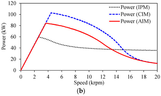 The machines’ flux-weakening performances were computed using a combined numerical and analytical method described in [9,37]. The obtained torque-speed and power-speed curves of the machines are illustrated in Figure 6. Although IMs have remarkable flux-weakening performance in the constant torque region, their performance in the constant power region, particularly in the deep flux-weakening area, falls far short of that of IPM machines [9]. As seen in Figure 6a, all the machines have the same maximum output torque. Although IMs’ characteristics are poorer than IPM machine at high-speed region, the maximum torque/power-speed characteristics of the IMs are not poorer than IPM machine. As clearly seen in Figure 6, in some speed regions, IMs show even better flux-weakening characteristics than the IPM machine. Therefore, in terms of flux-weakening characteristics, the IM can replace IPM with a slight sacrifice of torque in the very deep flux-weakening region. Moreover, it is also revealed that the AIM has poorer flux-weakening characteristics than the CIM. The main underlying cause is that due to its lower fundamental winding factor, the AIM requires more turns to retain the average torque.