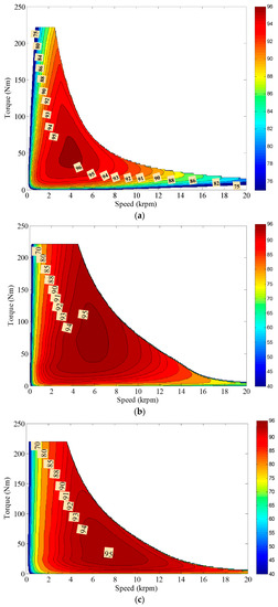 Comparison of the efficiency maps of the considered machines. (a) IPM machine. (b) CIM. (c) AIM.
