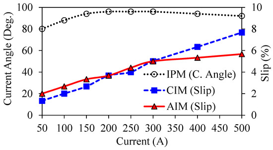 To be able to compare the torque-generating capabilities, the influence of electric loading on the torque is investigated. Figure 8 depicts the variation current angle of IPM and slip percentage of IMs that deliver the maximum torque. The current angle delivering the maximum torque for various peak current changes between 80° to 98°.