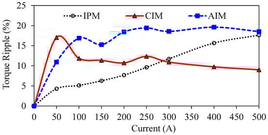 The torque ripple percentages for various electric loadings are compared in Figure 10. As seen, for the IPM machine, the higher the electric loading, the higher the torque ripple. On the other hand, for CIM, the higher the electric loading, the lower the torque ripple. For AIM, the torque ripple increases with the increasing electric loading until the rated current is reached. As previously explained, the electromagnetic torque of PM machines consists of PM and reluctance torque components. As seen in (1), the PM torque component is proportional to the stator current, but the reluctance torque component is proportional to the square of the stator current. The reluctance torque component diminishes as the saliency ratio drops with increased electric loading. However, when the electric load increases, the impact of PMs becomes less prominent (PMs are getting demagnetized) as seen in Figure 11. Furthermore, the saturation caused by PMs may affect the increase in torque of the IPM machine. In fact, the IPM machine has PMs with constant flux magnitude. Even if the induced voltage is increased in the stator and the flux produced by the stator windings is increased with increasing excitation current, the flux produced by the PMs cannot be increased.