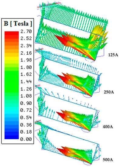 where , , and are the magneto-motive force of stator, rotor, and air-gap, respectively, and , , and represent the surface integrations of flux intensity of the same regions. As seen in Figure 12, the saturation levels are similar, and they increase dramatically with increasing electric loading.