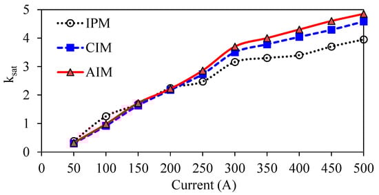 Essentially, as clearly seen in Figure 11, the flux generated by PMs dramatically reduces as the excitation current increases. This figure explains the underlying reason behind the lower torque generation of the IPM machine under overloading operating conditions. Once the IPM machine is loaded from 50% to 200%, the flux production capability of PMs reduces substantially. The flux produced by the stator windings dominates the flux produced by the PMs. In other words, PMs are temporarily demagnetized by the stator field. Therefore, since the flux density of the rotor core is much higher than the PM’s flux density, quite a low flux can be produced by the PMs. Since the excitation and reluctance torque components of the IPM machine are decreased dramatically with increasing excitation current, it could not generate torque as high as IM (see Figure 9). For the IPM machine, the total flux is limited by PMs and saliency. However, for IM, with the increasing injected current, both the stator and rotor circuit’s fluxes are increased since the rotor bar current will be increased by the increased excitation current. Therefore, since the total flux is increased, the obtained torque will also be increased. In theory, in comparison with PM machines, if the current density and heating issues are ignored, there is no torque limitation for the IMs. In order to estimate the saturation levels of the machines, the saturation factors for both of the machines have been calculated by using (6) and the variation of the calculated saturation factors with respect to electric loading is illustrated in Figure 12.