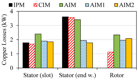 Figure 13 shows the calculated stator in-slot winding and end-winding, and rotor bar copper losses of the considered machines. As seen in Figure 13, almost the same stator slot copper losses are obtained except for the AIM. As clearly seen from the stator end-winding copper loss comparison, while the IPM machine, CIM, and AIM have almost the same value, the AIM1 and AIM2 have almost half the value due to the low number of turns per phase requirement. Note that, since the stack lengths of the AIM1 and AIM2 have been increased, their stator slot copper losses have also been increased. Therefore, it can be deduced that due to increased stack length, the number of turns and hence the stator copper loss is reduced. The rotor copper loss of the CIM is approximately half of the AIM’s rotor copper losses because of the remarkably low (approximately half of the 24S/8P) winding MMF harmonics of 48S/8P with a 5 slot-pitch single-layer winding topology (see Figure 2).