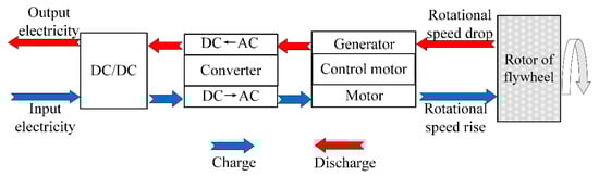 The flywheel battery mainly comprises a flywheel rotor, flywheel control motor, high-speed bearing, vacuum chamber and DC/DC device, and its basic structure is shown in Figure 1. There are three working modes of flywheel battery: charge, storage and discharge. The specific working principles are as follows, shown in Figure 2.