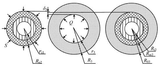 Carbon fiber composites are anisotropic materials with high strength along the fiber direction but very low strength perpendicular to the fiber direction. The strength perpendicular to the fiber direction restricts the increase of the flywheel linear velocity. The radial strength of the flywheel can be effectively improved by using a multi-layers interference assembly wheel flange. For the wheel flange of multi-layer interference assembly, it is generally necessary to assemble layer by layer from the inside to the outside, firstly assemble the innermost two layers, then assemble the third layer, and finally to the Nth layer, a total of N − 1 times of assembly are required. Figure 5 is a schematic diagram of the assembly of a three layers composite wheel flange. After assembly, the first and second layers of the wheel flange are regarded as a whole without initial stress. The inner radius and outer radius are ri1, Ro2, and the inner radius and outer radius ratio is . Consider the first layer and the second layer as the inner layer and the third layer wheel flange as the outer layer to assemble it.