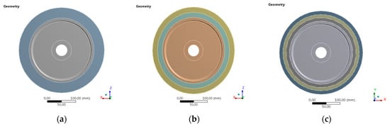 Single layer, double layer and three layers wheel flange layers are selected for analysis by commercial simulation software Ansys. The thickness of each layer of wheel flange under the same scheme is the same. Scheme I, II and III correspond to the layer thickness of 36 mm, 18 mm and 12 mm, respectively. The interference between all contact surfaces is set to 0.5 mm. The three-dimensional models corresponding to the three schemes are shown in Figure 6.