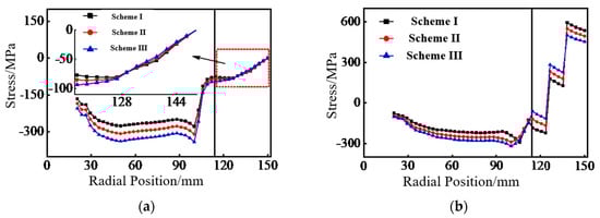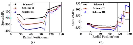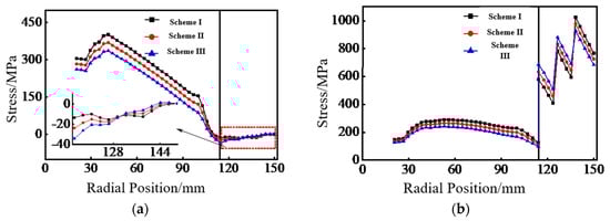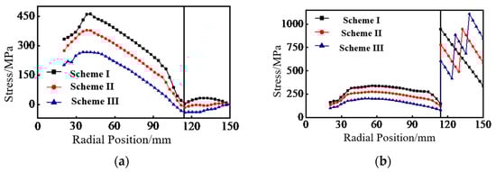 The stress distribution curve of the flywheel rotor under the maximum speed of each scheme is shown in Figure 8. Due to the centrifugal force, most of the radial compressive stress on the wheel hub is converted into tensile stress. The maximum tensile stress is inversely proportional to the number of the wheel flange layers, and the compressive stress on the wheel flange is also significantly reduced compared to when the flywheel is stationary. In scheme I, the radial stress at the junction of the wheel flange and the wheel hub is 3.77 Mpa, indicating that the interference assembly pressure between the wheel flange and the wheel hub has been completely released, and the flywheel rotor has failed. However, there is still radial compressive stress between the layers of the flywheel rotor in scheme II and scheme III, which can meet the use requirements. The changing trend of hoop stress is similar to that in the static state, but the stress value increases greatly.