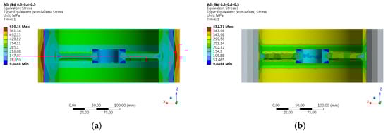 The stress curve of the flywheel rotor at the highest speed is shown in Figure 10. The wheel hub’s radial compressive stress has been transformed into tensile stress. The stress value is inversely proportional to the interference between the inner layer of the wheel hub and the rim. The maximum compressive stress on the wheel flange occurs in the inner layer, and the maximum tensile stress occurs in the outer layer of the wheel flange. When a small interference is used between the inner layer of the wheel flange and the wheel hub, and a large interference is used between the outer layer and the middle layer, the overall radial stress level on the wheel flange is low, and the radial stress level in each layer is basically the same, which can effectively prevent fatigue damage of a layer in advance due to high-stress level. In terms of hoop stress, when a small amount of interference is used between the outer layer and the middle layer, the hoop stress level on the whole flywheel wheel flange is low.