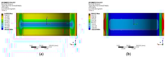 Wheel flange direction stress cloud in a static state. (a) Radial stress contour of wheel flange; (b) Hoop stress contour of wheel flange.