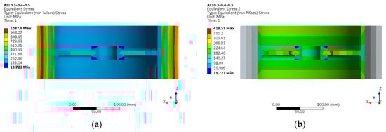 The radial and hoop stress contours of the flywheel rotor wheel flange at the highest speed are shown in Figure 14. Under the action of centrifugal force, the compressive stress on the wheel flange of the flywheel is greatly reduced. The maximum compressive stress on the wheel flange appears at the junction of the inner wheel flange and the wheel hub, and the maximum value is about 38.50 MPa, which is smaller than the radial compressive strength of the wheel flange material. The maximum radial tensile stress on the wheel flange appears on the outer wheel flange, and the maximum value is 0.62 MPa, less than the radial tensile strength of the wheel flange material, and no failure occurs. At the highest speed, the hoop stress decreases in steps from the inside to the outside. The maximum hoop stress on the wheel flange is 1079.8 MPa, which is much smaller than the hoop tensile strength of the wheel flange material, and no failure occurs.