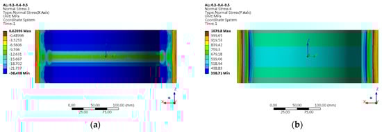 The stress nephogram of wheel flange under a static state is shown in Figure 12. The outer wheel flange’s outer side bears radial tensile stress, the rest of the wheel flange bears radial compressive stress, and the flywheel is under pressure. The maximum radial compressive stress borne by the rim is located in the middle of the inner layer along the axial direction. The maximum compressive stress is 99.92 Mpa, which is less than the radial compressive strength of the wheel flange material. The maximum radial tensile stress borne by the rim is 1.44 Mpa, which is less than the radial tensile strength of the wheel flange material. The hoop stress increases from the inner layer to the outer layer and jumps at the junction of the two layers. The maximum hoop stress appears at the outer wheel flange, with a maximum value of 604.91 Mpa, less than the hoop tensile strength of the wheel flange material.