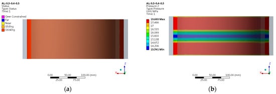 The outer layer and the middle layer of the flywheel rotor are most easily separated. In order to further confirm the safety of the flywheel rotor, extract the cloud diagram of the contact state between the outer layer and the middle layer of the flywheel rotor wheel flange, as shown in Figure 15a. It can be seen that the outer layer and the middle layer of the wheel flange are in good contact without separation. As shown in Figure 15b, the contact pressure nephogram between the outer and middle layers of the wheel flange is extracted. It can be seen that the pressure between the wheel flange and the wheel hub is lower in the middle and higher on both sides along the axial direction. That is, the middle direction is the most prone to loosening, and the minimum pressure is 13.74 Mpa, which indicates that there is always pressure between the wheel flange layers at the highest speed, and the flywheel rotor is safe.
