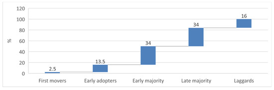 The sequence of adopter stages from Roger’s “Diffusion of Innovation” [20], and the size of each group in terms of percentage of the population.