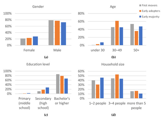 The distribution of sociographic differences across the three adopter groups in percent: First movers (grey), Early adopters (orange), Early majority (blue). (a): Gender distribution. (b): Age distribution. (c): Education distribution. (d): Household size distribution.