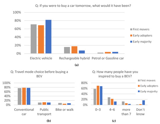 The share of responses for the three adopter groups regarding questions about their future choice of vehicle (a), previous travel mode (b) and the amount of people they have inspired to buy a BEV (c).