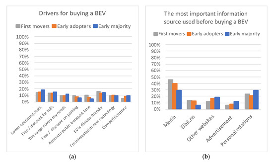 The share of responses for the three adopter groups regarding drivers for buying a BEV (a) and important information source when buying a BEV (b). Elbil.no is the website of the Norwegian EV association.