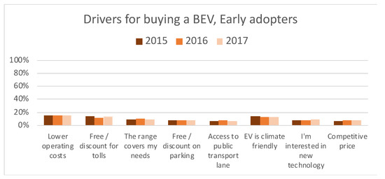 As shown in Table 2, each adopter group consists of responses sampled over several years. To see if there is a change over time, a specific response for one of the adopter groups is investigated. In Figure 5, the differences in opinions by early adopters between 2015 and 2017 regarding drivers for buying a BEV are presented. Regarding lower operating costs, the opinions are the same for each year. For the other responses, the change between years is within a difference of two percentage points, in contrast to the maximum difference between adopter groups to the same responses of five percentage points.