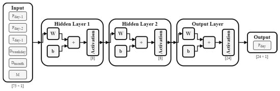 The neural network was trained on the collected data (Table 3) from 2021 and the input data were structured as shown in Equation (7). The input data were also normalized between 0 and 1.