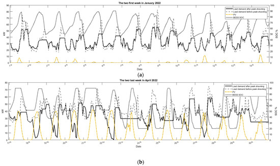 The load demand at the parking garage before and after utilizing peak shaving for (a) the first two weeks of January 2022 and (b) the last two weeks in April 2022, as well as the available PV power and the BESS’s SOC during the time period.