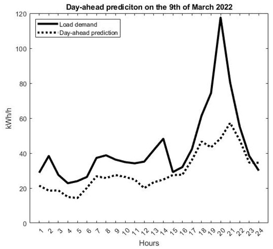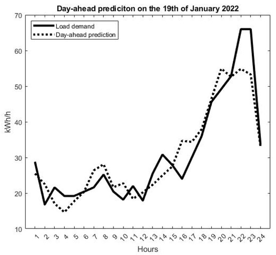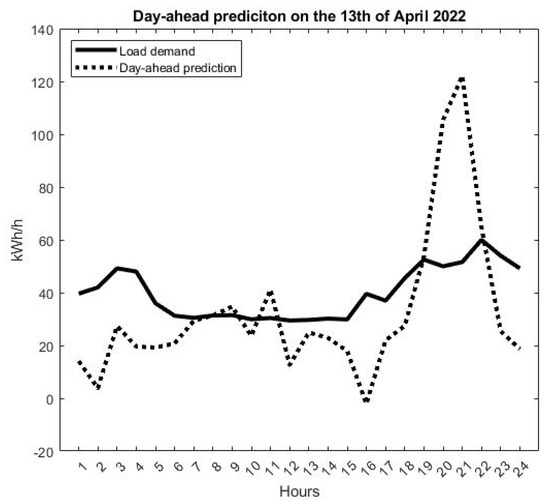 An attempt was made to make a day-ahead prediction of the 120 days in January–April 2022 using the created neural network. Each day was evaluated using RMSE. Three of these days were investigated: the days with the best RMSE, the worst RMSE, and with the high load demand peak. The best predicted day was the 19th of January, with an RMSE index of 5.25 and the day-ahead prediction can be seen in Figure 5. The worst predicted day was the 13th of April with an RMSE index of 26.27 and the prediction can be seen in Figure 6. Finally, the day with the highest load demand peak can be seen in Figure 7, with an RMSE index of 19.37.