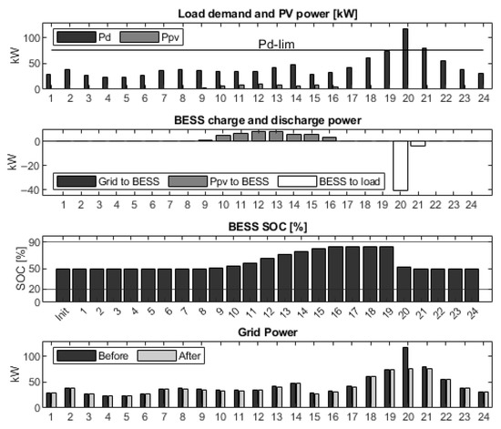 - Charging mode 1: When the load demand is less than the determined peak shaving limit. The mixture of power from the grid or the PV system for the load and the BESS is determined by rules 2–5.