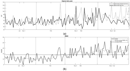 The RMSE value for each day in (January–April 2022) and the average of 13.96 as well as the moving average during the time period are shown in Figure 11b. Figure 11a also shows the highest daily peak hour in the predicted load demand and the real load demand.
