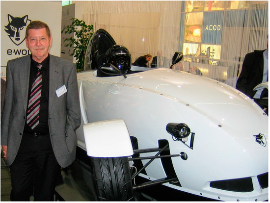 Due to his many years of work at DFG, Walter Lachenmeier was well connected to the German research landscape in the field of engineering sciences with a focus on energy technology as well as related disciplines. Following his position at Li-Tec Battery GmbH in battery development, he was offered to participate in a startup electrical car company, e-Wolf GmbH. Walter Lachenmeier was a pioneer in Germany when it came to electrical mobility: forward-looking and—as others tended to brake here—also impatient and relentless. Ten years beyond his retirement age, he still managed to inspire young people with competence and passion. These efforts culminated in presenting an extreme sports car with an all-electric drive in ultra-lightweight design at the 2009 IAA (International Automobile Exhibition, Frankfurt am Main, Germany) (Figure 2). The e-Wolf E1 was a joint project of Leichtbauzentrum Sachsen GmbH (LZS), the Institute of Lightweight Engineering and Polymer Technology at Technical University Dresden, e-Wolf GmbH and Li-Tec Battery GmbH. For the first time, this vehicle combined an ultralight chassis made of a carbon aluminum construction with innovative flat cell technology, carbon rims, formula sports technology and road approval [36]. e-Wolf GmbH received the iF Design Award 2010 for its campaign and multimedia installation at IAA.