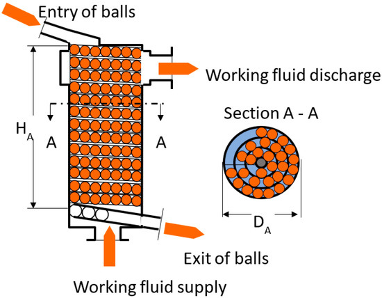 The final patented invention of Walter Lachenmeier dealt with the storage of energy by a heat accumulator, which may be used to store energy necessitated by grid fluctuations (e.g., due to wind power and solar energy). For example, it can be applied to store energy during the day and make it available at night to charge electric vehicles. Even in the event of a temporary overproduction of “green electricity”, it makes more sense to store it in a more suitable form than to use it only to heat night storage facilities [38]. The accumulator consists of non-pressurized and pressurized heat exchangers to cool the system down using the counterflow principle. Balls were used as a medium to exchange heat. The heat is moved via the balls, which are guided to the storage tank and reservoir containing the coolant (e.g., water) [32]. The principle of the ball-circulating heat accumulator is shown in Figure 3. Heat is exchanged through the balls to the reservoirs.
