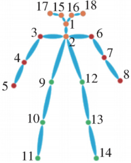 The OpenPose algorithm for human pose recognition detects 18 key points on a person, as shown in Figure 2, and the information of each key point is shown in Table 1.