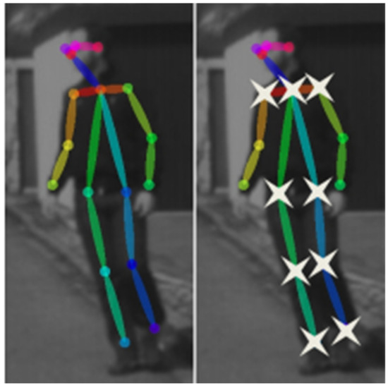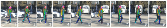 There are two main types of methods to fit the human skeleton information, bottom-up and top-down [19]. Initially, researchers usually use the top-down approach, in which the human body position in the image is detected first and then the key points of the human skeleton are estimated separately. This method is more accurate but relies on the results of pedestrian detection and may have problems such as duplicate detection or omission. OpenPose is a real-time deep-learning-based multi-person 2D pose estimation system developed by Carnegie Mellon University [20]. The system is an open-source library based on convolutional neural networks and supervised learning and developed with Caffe as the deep learning framework, which is able to detect and track the activities of human body movements, facial expressions and finger movements in real time with excellent robustness. In the scenario of pedestrian crossing intention prediction, the system requires high computation time and accuracy in the recognition algorithm; therefore, OpenPose is used to fit the skeleton key-point information of pedestrians.