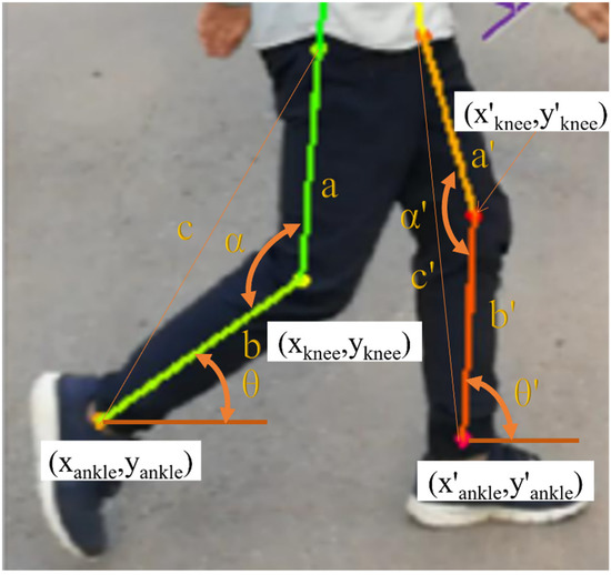 The calculation of the angle between the calf and the thigh involves a total of three key points at the hip, knee and ankle on the left and right sides of the pedestrian and the calculation formula is shown in Equation (2); a is the length of the thigh, b is the length of the calf, c is the length of the pedestrian side of the hip to the ankle on that side and the formula is shown in Formulae (3), (4) and (5), respectively, is the horizontal coordinate of the critical point of the pedestrian’s hip and is the vertical coordinate of the critical point of the pedestrian’s hip.