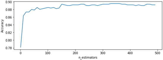 The learning curve is used to determine the range and trend of the parameters and the number of decision trees n_estimators with the greatest impact on the random forest model is tuned. To obtain a more robust model, cross-validation was used. A 10-fold cross-validation was used in the experiment. Due to the large amount of data, the approximate range of the value was first determined within a number of trees of 0–500, with an interval of 10, and then the specific value was determined. As the number of trees increased, the accuracy of the model was the first to increase rapidly on the test set, then increased slowly and, finally, was basically smooth, as shown in Figure 6. Between 320 and 370 trees, the model accuracy was better and for 331 trees, the accuracy was 89.5%. Then, calculations were continued within that range to determine the exact number of decision trees. The final result is that the model works better with an accuracy of 89.7% when the number of decision trees is 345. Considering that too many decision trees will make the model operation time longer, the final parameter size was determined to be 320.