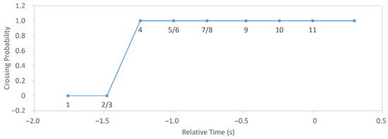 From Figure 10, it can be seen that the pedestrian’s intention to cross can be accurately predicted about 1.2 s before the pedestrian starts to cross and the prediction results of the algorithm do not change after that, indicating that the algorithm can effectively predict the pedestrian crossing intention. The reason that the point on the curve in the figure corresponds to the two points in Figure 9 is that the longitudinal distance of the pedestrian from the car changes less and the relative time change is shorter and it is detected by the engineering machine as no change; the results of the intention prediction model are the same, so the two points on the plotted curve overlap.