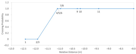 Figure 11 shows the variation in pedestrian crossing intention with the longitudinal relative distance between pedestrians and vehicles, and the human crossing intention can be accurately predicted roughly at a longitudinal relative distance of 9 m between pedestrians and vehicles. For the problem that the model did not recognize the pedestrian intention at the beginning, it may be caused by an error in the model prediction.