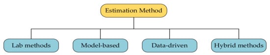 Inaccurate estimation of battery SOH can affect battery life, safety, and reliability []. By monitoring the battery SOH in real time to correct the SOC, the operation of the BMS facilitates, and thus improves, the driving safety of electric vehicles, reducing the maintenance and use costs of electric vehicles []. Scholars have completed a lot of research on improving the accuracy of SOH estimation; a classification of the methods used for SOH estimation is shown in Figure 7, and their advantages and disadvantages are summarized in Table 3.