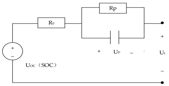 The ECM-model-based SOC evaluation requires the derivation of the circuit models consisting of various circuit elements arranged in series or parallel combinations, such that they replicate the dynamics of the battery. Various ECM models have been proposed, including the Rint model, the RC model, and the Thevenin model []. The Thevenin model is used as typical ECM, which is designed using one RC group, a resistance, and voltage source, as depicted in Figure 4.
