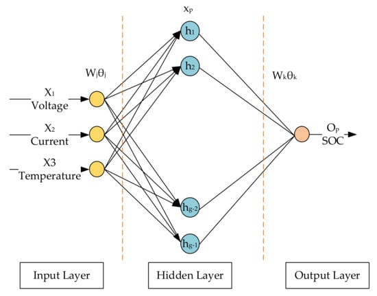 The model-based estimation method solves the problem of traditional methods, i.e., that they cannot be estimate in real time, and has the advantages of fast estimation and a scientifically rigorous design process. However, its accuracy is easily affected by the modeling accuracy, and its parameters are time-varying in the application process, resulting in nonnegligible model errors [,]. In order to avoid the impact of modeling accuracy, a data-driven class method without modeling is proposed. The data-driven estimation techniques can estimate SOC accurately by measuring battery parameters, including current, voltage, and temperature, thus, battery model, added filter used in model-based approaches can be avoided. Moreover, the network parameters of data-driven methods are determined by the self-learning algorithm. The process is completely different from model-based estimation techniques, where human expertise and substantial time are needed for parameter estimation. The data-driven approaches often require the use of a machine learning (ML) platform in order to obtain the relationship and rules from the data. The basic method of the data-driven method is a neural network (NN). The basic structure of a neural network (NN) consists of a three-layer formation, as shown in Figure 5.