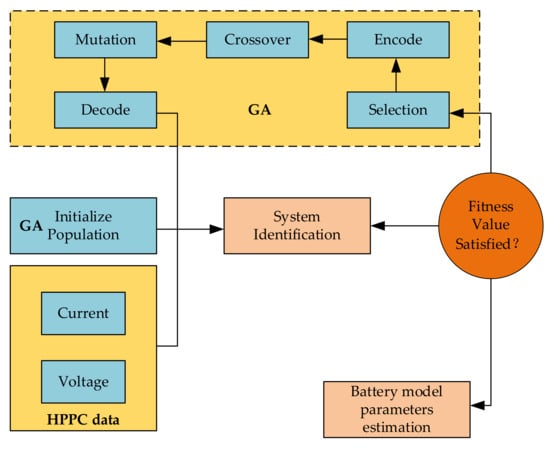 The authors in [] proposed a genetic algorithm (GA) to find the optimal battery parameters of ECM in order to estimate SOC using a hybrid pulse power characterization (HPPC) experiment, as shown in Figure 6. A series of actions, including crossover, mutation, and selection, is employed to identify the model parameters. The measured current and battery terminal voltage are assigned as the input and output of the model, respectively, during the process of parameter identification. The fitness value is determined by calculating the difference between the measured voltage values and the model output. The proposed method can estimate the SOC of the LIB pack accurately and prevent the battery pack from overcharging and over-discharging, with the SOC error being less than 1%. The experiment’s results also confirm the suitability of the proposed algorithm for online BMS execution.