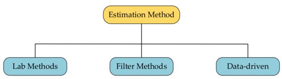 The traditional estimation method is simple and efficient. Its disadvantage is that it requires a high experimental environment, and, using this method, it is difficult to accomplish real-time estimation []. The adaptive filtering method is suitable for online real-time estimation, which is superior to the laboratory method, but the accuracy of this method relies on the model accuracy and the type of filtering []. The data-driven class estimation method does not have to consider model accuracy and filter type, which conquers the shortcomings of the filtering method estimation, but the accuracy of the data-driven class method is highly dependent on high-quality data [].