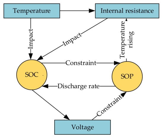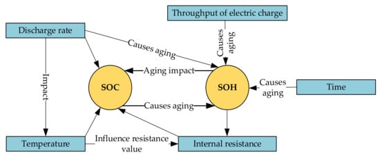 SOH is mainly influenced by SOC, temperature, discharge multiplier, cumulative battery life, number of charge/discharge cycles, and cumulative throughput of charge []. SOC is mainly influenced by temperature, battery health status, discharge multiplier, etc. The interactive relationship between SOH and SOC of the battery is shown in Figure 10.