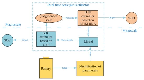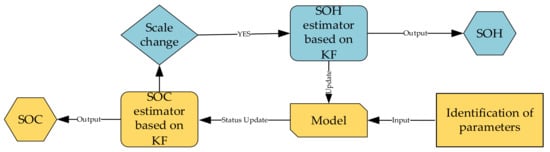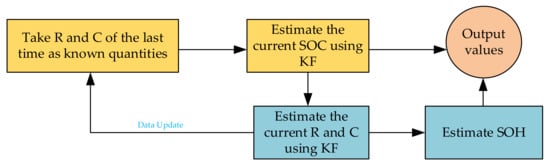 Most of the relevant studies on joint model-based estimation use the equivalent circuit model (ECM), and, on top of that, various filtering algorithms are applied to estimate the battery state and aging parameters, respectively, which are coupled with each other as inputs. Since SOC and SOH have different time scales, two coupling ideas are derived from this: simultaneous estimation and joint multi-scale []. The joint estimation process at the same time scale is shown in Figure 12.