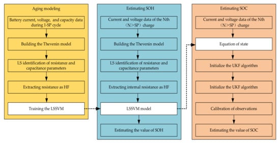Yuan Zou [] has proposed a fusion method to construct a coupled thermal–electrical-aging cell model for SOC/SOH joint estimation. In the estimation model, UKF is introduced to estimate SOC, LSTM-RNN to estimate SOH, and the UKF-NN method with dual time scales is designed to estimate SOC and SOH jointly. Figure 15 illustrates the flowchart of the online implementation of this joint estimator.