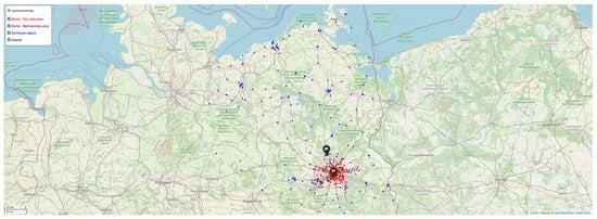 Data sample—Maps of the northeast region of Germany. Points represent individual retail stores; Red: Retail stores in the Berlin zip code area (share: 50%); Purple: Berlin metropolitan area (40 km) (share: 20%); Blue: Other retail stores (share: 30%)—own illustration based on leaflet.