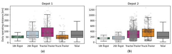 Evaluation of daily operating distances per truck class; (a) Depot1; (b) Depot2; Sample points are scattered. Boxplots include the lower quartile, median, upper quartile, and whiskers (±1.5 IQR); Colors indicate different truck classes: 18-t rigid (green), 26-t rigid (blue), tractor-trailers (purple), truck-trailers (orange), and total (grey)—own illustration.
