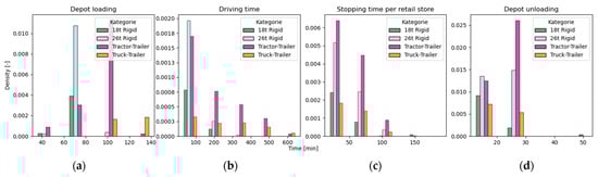The corresponding daily operating times are visualized in Figure 3. Vehicle scheduling specifies four timestamps, from vehicle loading at the cargo terminals within the depots (), driving time (), stop time at customer retail stores (), and eventually vehicle unloading at the cargo terminals to complete one single tour. The visualization aggregates depot locations and visualizes each truck class separately. While vehicle loading typically takes 60–80 min (lower and upper quartile) for rigid solo trucks, 90–110 min for tractor trailers, and 110–120 min for truck-trailers. Similar to the daily mileage, truck trailers and tractor trailers exhibit higher driving times and wider span compared to rigid solo trucks. Stops at customer retail stores typically last between 40–60 min across all truck classes, with over 80 min occurring as well, especially for larger truck classes. Eventual unloading takes only 15–22 min across all truck classes. As mentioned earlier, additional breaks such as the mandatory 4.5 h driving break are not scheduled as these are covered at customer stops.