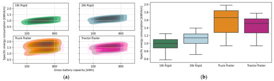 Trip-averaged specific energy consumption [kWh/km] per truck class. (a) Density plot over battery capacity (b) Sample-weighted boxplot per truck class. Boxplots indicate the lower quartile, median, upper quartile, and whiskers (±1.5 IQR); Colors indicate different truck classes: 18-t rigid (green), 26-t rigid (blue), tractor-trailers (purple),and truck-trailers (orange)—own illustration.
