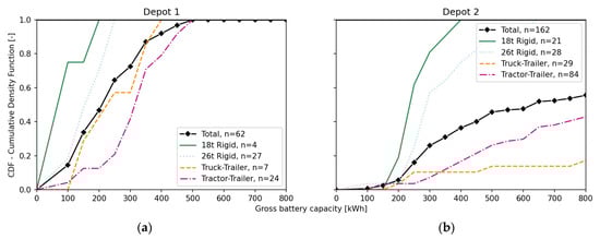BET feasibility per truck class as CDF over gross battery capacity; (a) Depot1; (b) Depot2—own illustration.