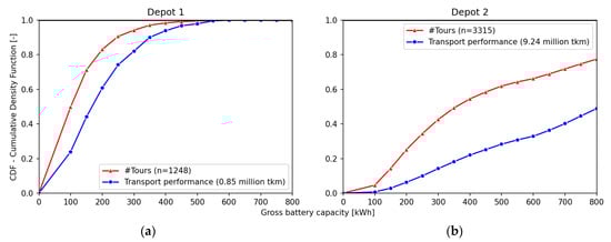 BET feasibility on tour- and tkm-level as CDF over gross battery capacity; (a) Depot1; (b) Depot2—own illustration.